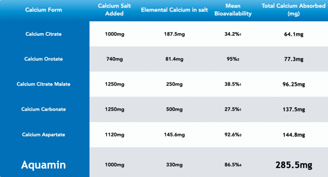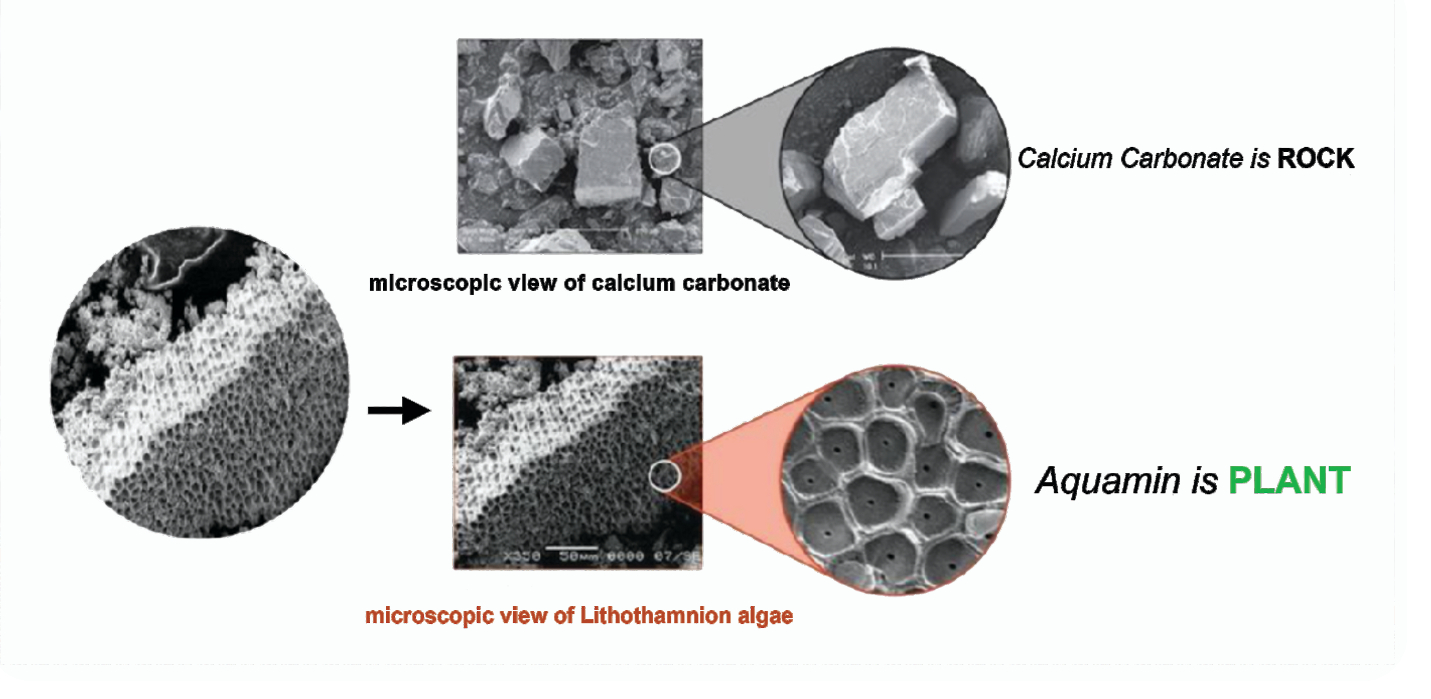 AquaminTM has been shown to have 10 times the surface area of calcium carbonate giving it a very high bioavailability.