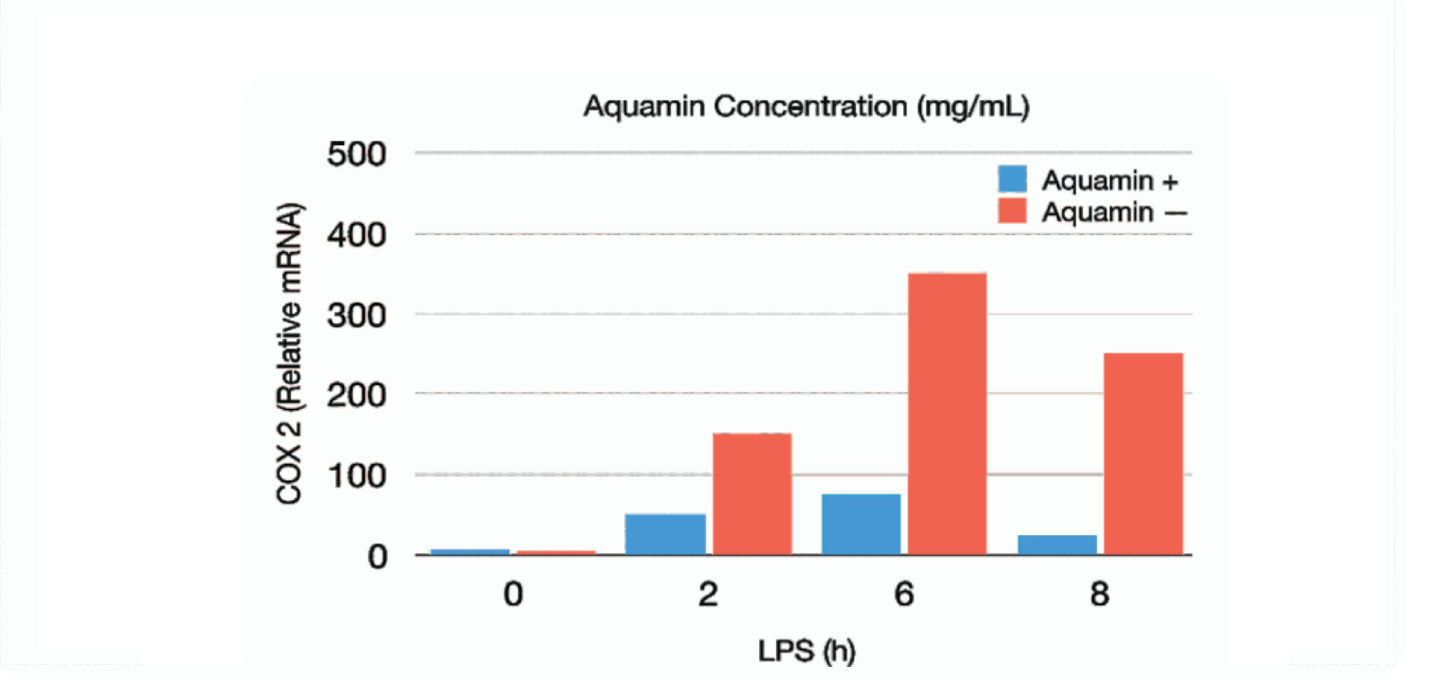 In vitro trials on macrophage cell lines have shown drastic reduction of LPS-induced COX 2 expression following treatment with AquaminTM