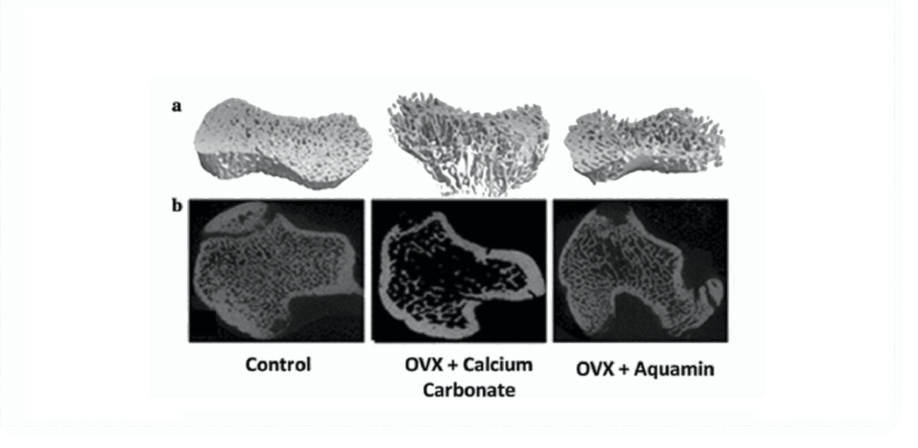 Pre-clinical trials on AquaminTM showed improved trabecular bone structure following 20weeks of ovariectomy (mimicking osteoporosis) when compared to calcium carbonate.