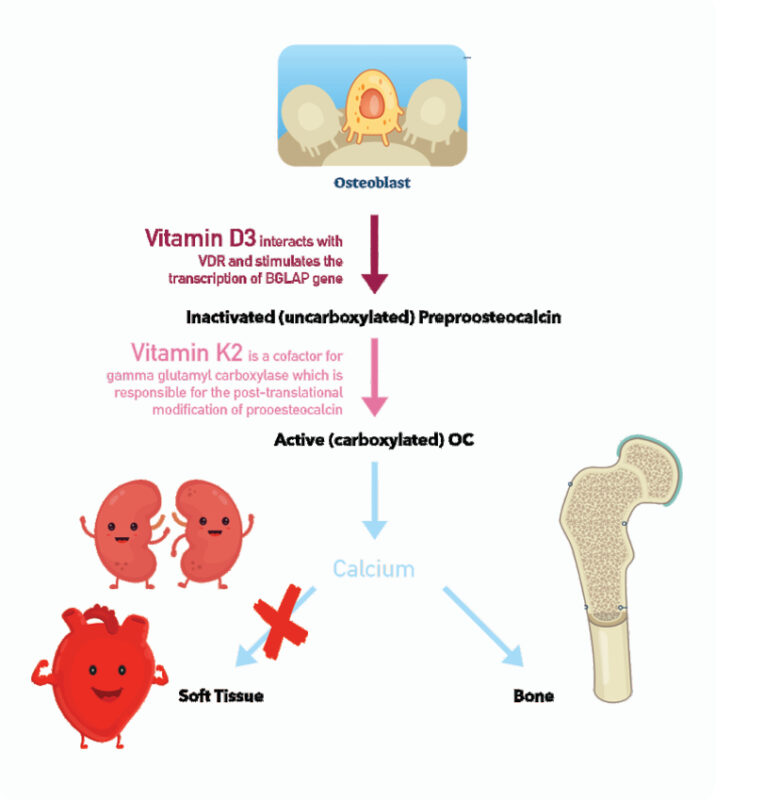 The activated osteocalcin binds the free calcium in the bloodstream and facilitates the mineralisation of the bone tissue.
